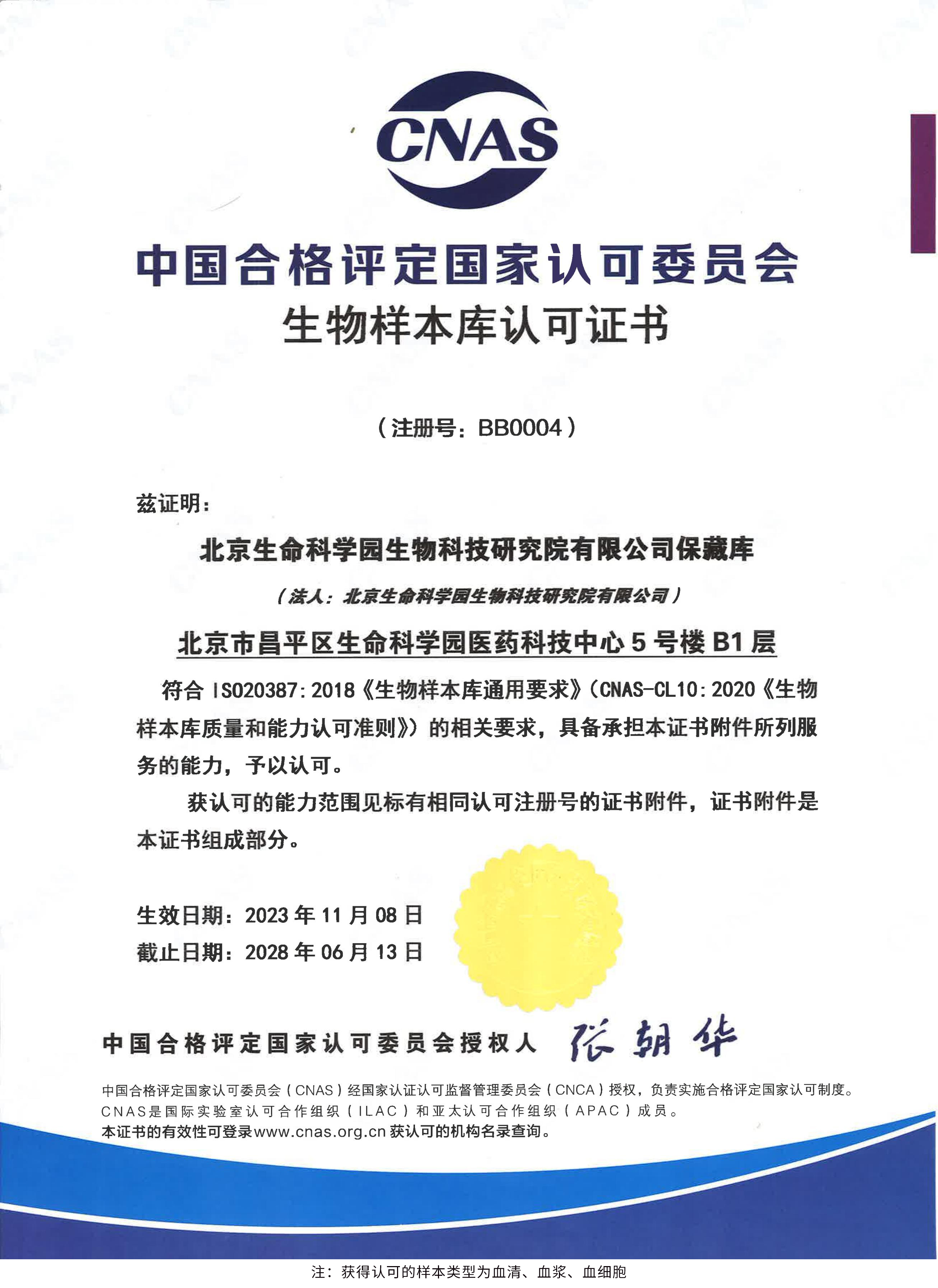 北京生命科學園生物科技研究院(以下簡稱“北京生物樣本資源庫”)(Biobank of Life Science Park,簡寫“BoLSP”)是一家由北京市科委和中關(guān)村生命科學園共同支持設立的第三方生物樣本庫公共服務平臺,秉承北京重大疾病臨床數(shù)據(jù)和樣本資源庫(以下簡稱“北京庫”)(Beijing Biobank of Clinical Resources,BBCR)十余年的發(fā)展成果,聚合眾多臨床樣本專家的專業(yè)共識,致力于在生命科學、生物醫(yī)藥研究領域發(fā)揮銜接樣本資源持有者與研究者的橋梁作用,解決生物樣本資源開發(fā)上下游信息不對稱、資源共享困難等問題。研究院在北京中關(guān)村生命科學園昌平園區(qū)建立了2000㎡生物樣本庫,最大存儲規(guī)模達1000萬份。研究院遵循CNAS-CL10:2020《生物樣本庫質(zhì)量和能力認可準則》,同時結(jié)合北京庫過去十年的工作經(jīng)驗與教訓,建立了一套完善的生物樣本保藏質(zhì)量管理體系,從人、機、料、法、環(huán)、控多個角度,實現(xiàn)生物樣本保藏過程的全面質(zhì)量控制,先后獲得國家科技部頒發(fā)的人類遺傳資源保藏行政許可證書和中國合格評定國家認可委員會(China National Accreditation Service for Conformity Assessment,CNAS)頒發(fā)的“CNAS認可證書”。